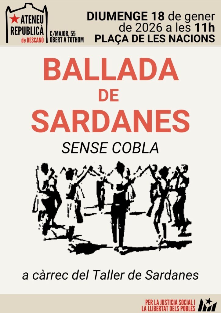 Agenda BALLADA DE SARDANES SENSE COBLA 18/01/2026 El taller de sardanes de Bescanó us convida a una ballada de sardanes sense cobla, una oportunitat per gaudir del ritme i l’alegria de les sardanes interpretades de manera diferent i participativa. < Entrada AnteriorEntrada Posterior >