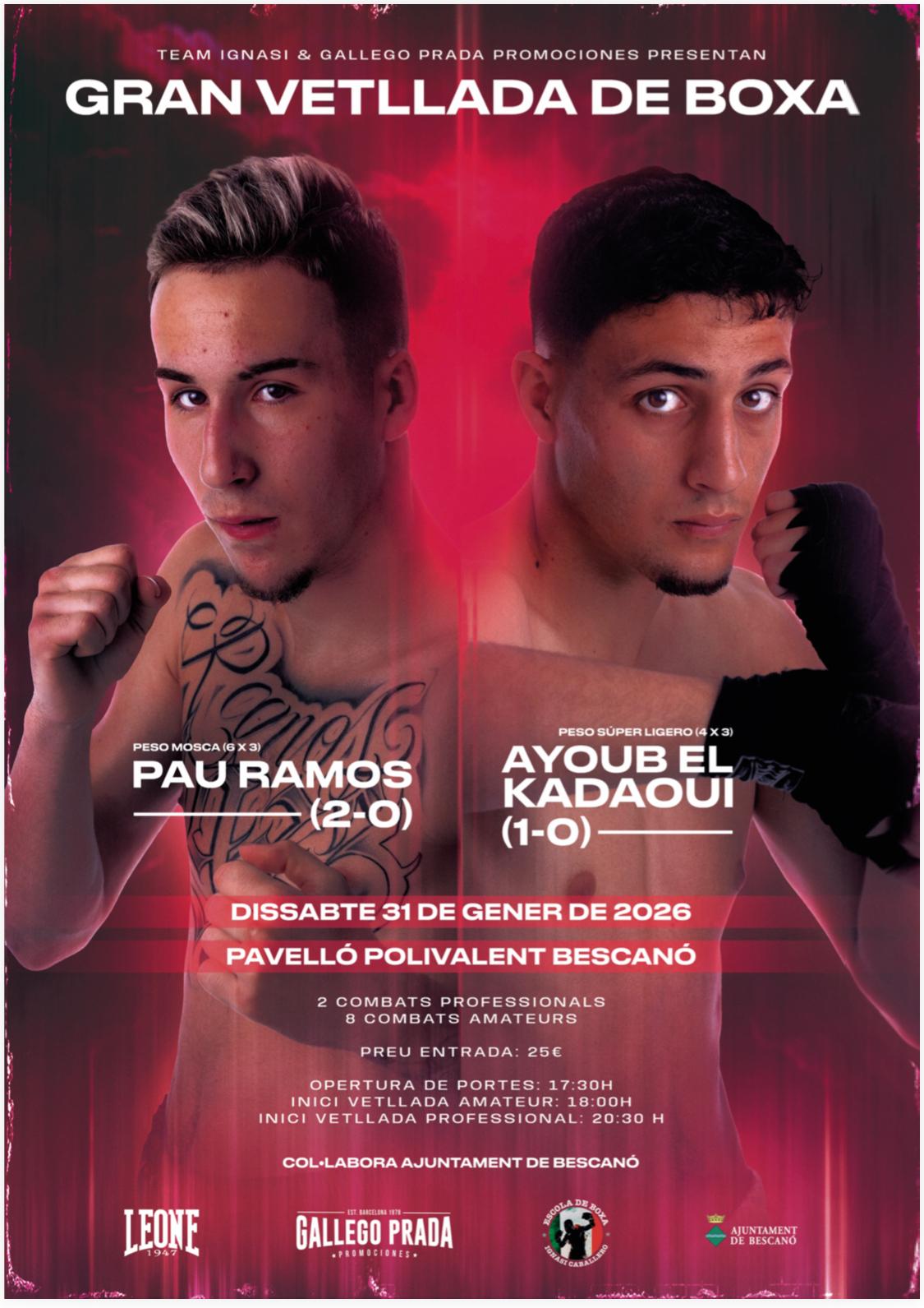 GRAN VETLLADA DE BOXA A BESCANÓ El proper dissabte 31 de gener de 2026, el Pavelló Polivalent 8 de Març de Bescanó vibrarà amb una gran nit de boxa Combats professionals i amateurs Combat destacat: PAU RAMOS vs AYOUB EL KABOULI Horaris🔹 Obertura de portes: 17:30 h🔹 Inici vetllada amateur: 18:00 h🔹 Inici vetllada professional: […]