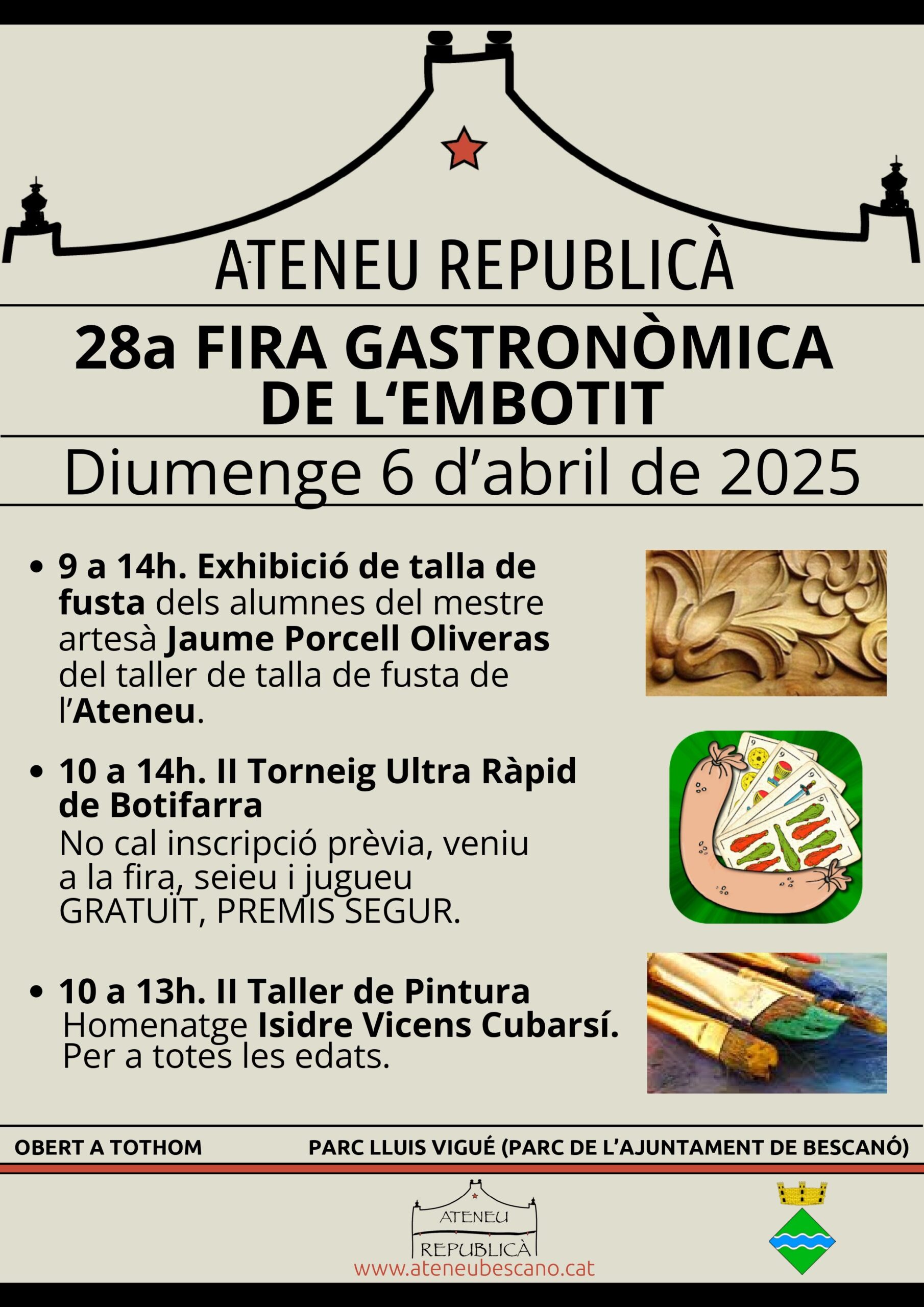 Torna la Fira Gastronòmica de l’Embotit de Bescanó! Prepara’t per gaudir d’una de les cites més esperades del nostre municipi. Diumenge 6 d’abril del 2025 al Barri Vell i Parc Lluís Vigué de Bescanó Consulteu totes les activitats que hi ha programades.