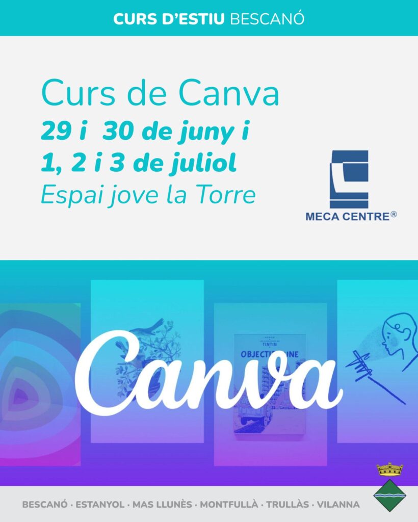 Curs de Canva que es durà a terme els dies 29 i 30 de juny i 1, 2 i 3 de juliol en horari de 17.30 a 19.00 hores a l’Espai Jove La Torre de Bescanó.