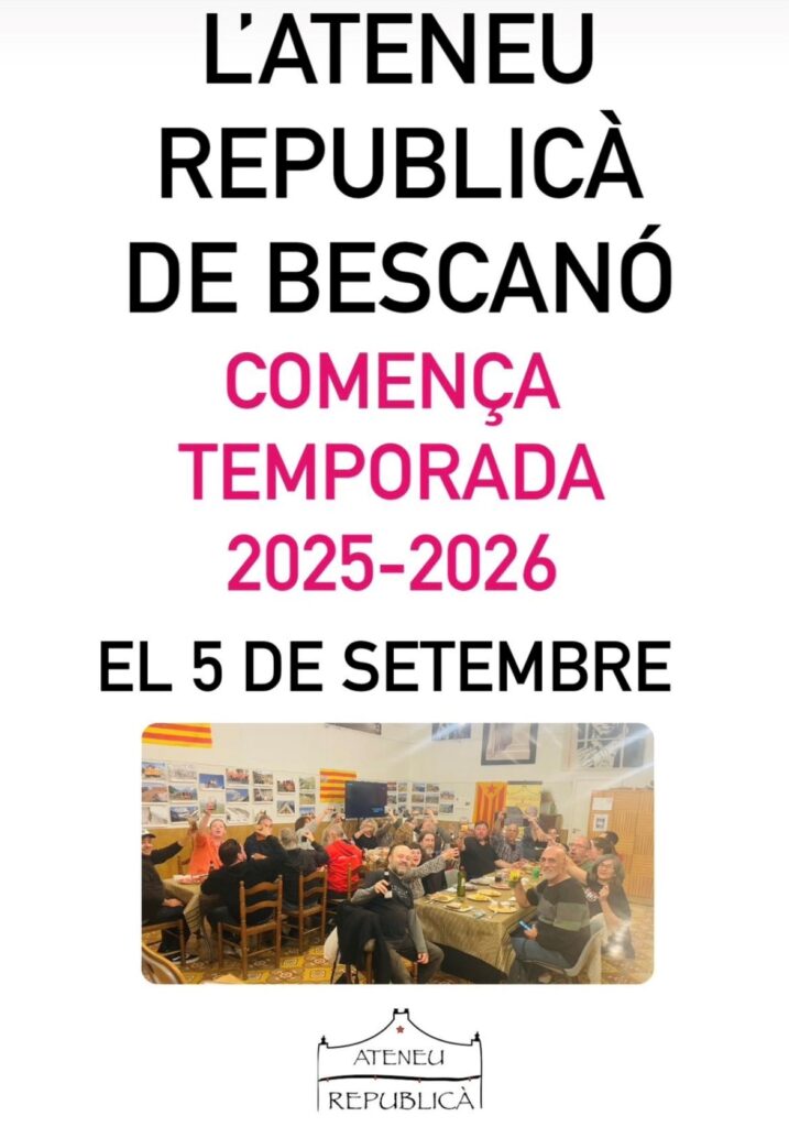 Agenda NOVA TEMPORADA DE L’ATENEU REPUBLICÀ DE BESCANÓ 05/09/2025 El proper divendres 5 de setembre donem inici a una nova temporada plena de ganes, il·lusió i força. Us hi esperem per compartir noves activitats, idees i moments de trobada. Per un futur lliure, compartit, solidari i combatiu! < Entrada AnteriorEntrada Posterior >